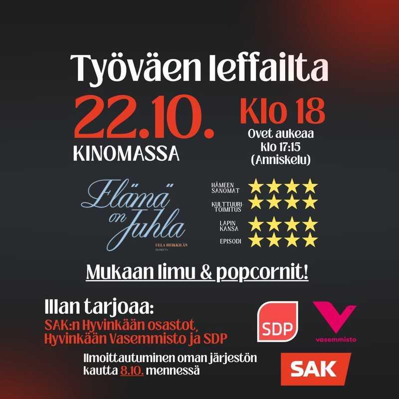 Tervetuloa SAK:laisten ammattiliittojen Hyvinkään osastojen, Hyvinkään vasemmiston ja SDP Hyvinkään yhteiseen työväen leffailtaan.