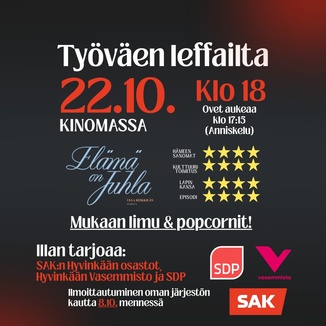 Sähköalantyöntekijäin ammattiosasto 013 ry tiedottaa Tervetuloa SAK:laisten ammattiliittojen Hyvinkään osastojen, Hyvinkään vasemmiston ja SDP Hyvinkään yhteiseen työväen leffailtaan.